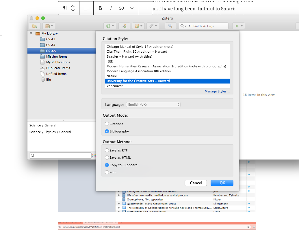 Zotero: Without Zotero, I would have found managing the overwhelming number of texts challenging. I was very pleased to have been recommended this software – although I am certain I did not make use of its full potential. I have long been faithful to Safari – however, so many coders seemed determined to make it hard to use and they indeed don’t help themselves. Zotero cannot be integrated with Safari, so I have gradually moved over to Chrome which can be, meaning you can simply click on a button in Chrome while looking at a webpage and it will store the information available – although, you must double check it’s all there and sometimes do a little bit of digging yourself. It was nevertheless very useful and saved a lot of time, especially when it came to compiling the bibliography (see last Zotero screenshot below, click on them to view).