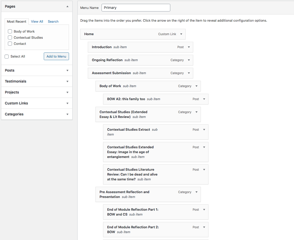 My blog and writing is extremely important to my process. One of the difficult things with this is reconciling the blog’s dual function as my digital note book and a means of presenting my ongoing development to others (tutors/students). Nevertheless, over the last few years, I have learned to label posts helpfully (although still sometimes forget) and use tags and categories. I suspect my menu-management is probably quite unnecessarily labour intensive and I can’t help thinking there must be a better way – however, I move certain posts into sections so they can be easily found rather than simply relying on categories that will pull up a string of related posts. The recent updates on WordPress will take time to get used to but I think there are some more helpful ways to store and track information available now. (Click in screenshots to view.)