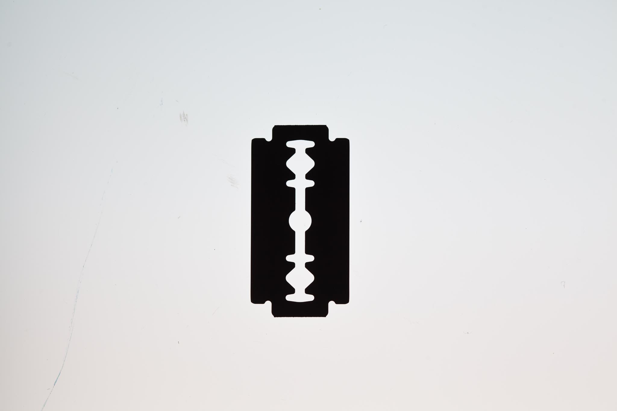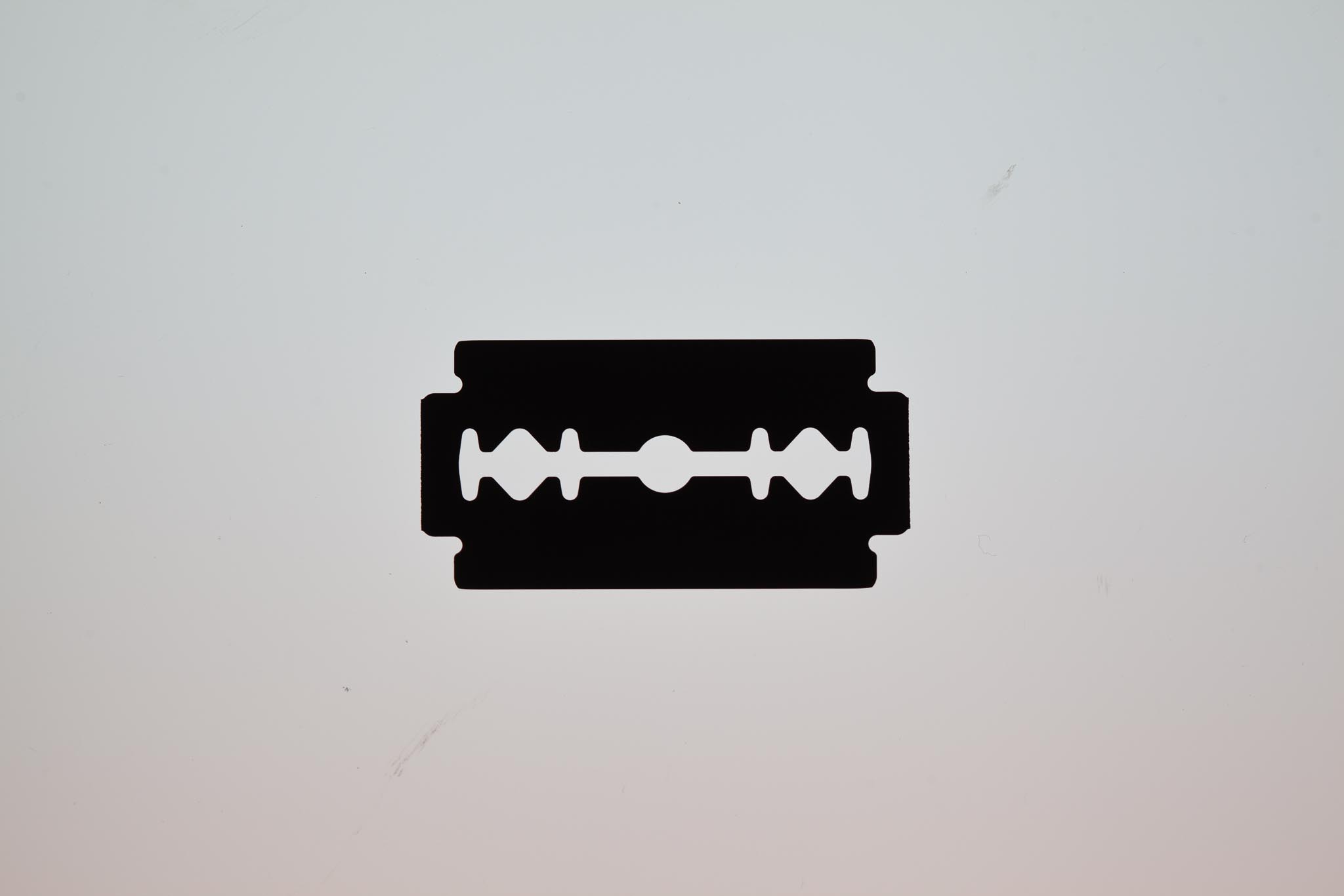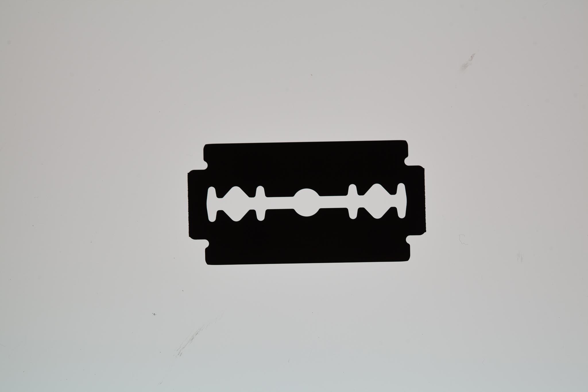 The most interesting image for me was when I used my own 50mm, and included the various signs of age and wear and tear. The reason I like this one is it looks like a cinema screen. I suspect it would be better if I manipulated the lines so it’s more accurately square on (I tried my best in-camera – maybe I’ll ignore the other pics which don’t excite me at all and give this another try tomorrow evening.) I will include some of the others but I can’t see myself taking them any further. I also shot a blade on the lightbox but I will try other ways of shooting it, I think. There’s a great passage in the Barad book where she uses the shadow of a blade to explain how diffraction works and does weird things. So it’s not only a good signifier of slicing, potential pain, a reference to Un Chien Andalou – it’s also a prop for Barad.